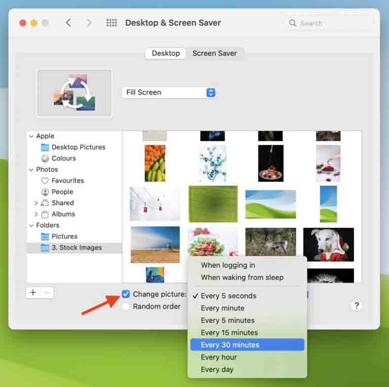 هذا هو! من الآن فصاعدًا ، سيقوم جهاز Mac الخاص بك تلقائيًا بتغيير خلفية سطح المكتب وفقًا للشرط المحدد في الخطوة 6 أعلاه. سيستخدم صور المجلد المضاف بالترتيب. ومع ذلك ، يمكنك تحديد مربع الترتيب العشوائي Random order لتبديل الصور عشوائيًا.
