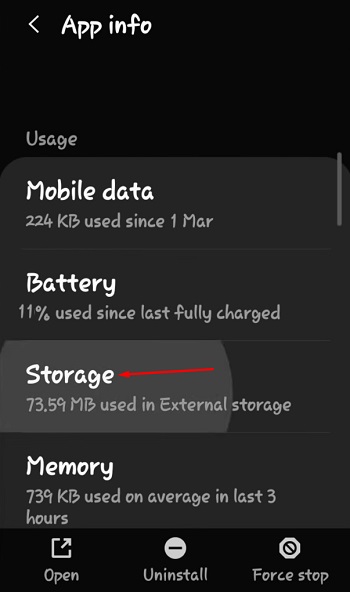 حدد App Info من القائمة التي تظهر وانتقل إلى علامة التبويب Storage & Cache.