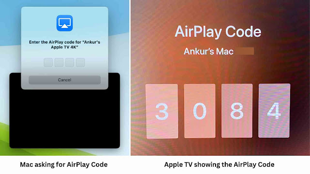 6) في المرة الأولى التي تقوم فيها بذلك ، سيعرض جهاز Mac نافذة منبثقة تقول ، أدخل رمز AirPlay لـ "اسم Apple TV الخاص بك". في الوقت نفسه ، سترى رمزًا مكونًا من أربعة أرقام على شاشة Apple TV. أدخل هذا الرمز على جهاز Mac الخاص بك لمصادقة الاتصال بين جهاز Mac وجهاز Apple TV الخاص بك.