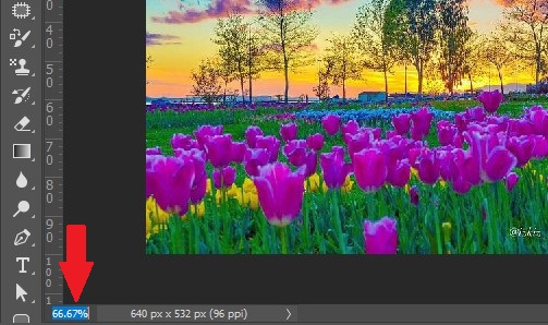 عند فتح صورة في Photoshop ، يقوم البرنامج بالتكبير تلقائيًا. يمكنك رؤية هذا المبلغ في أعلى الصفحة. على سبيل المثال ، نسبة التكبير / التصغير هنا هي 66٪.
