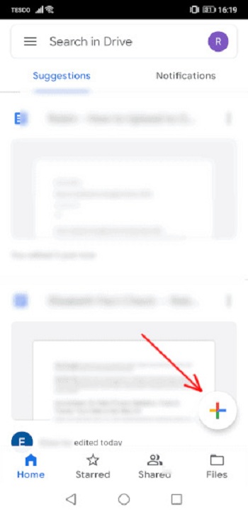 افتح تطبيق Google Drive. حدد علامة + في أسفل يمين الصفحة.