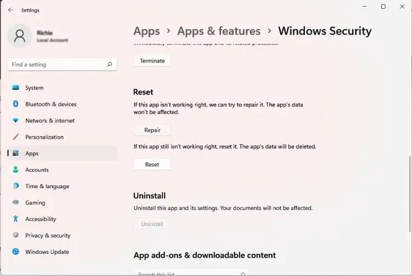 1- إعادة تعيين أو إصلاح Windows Security