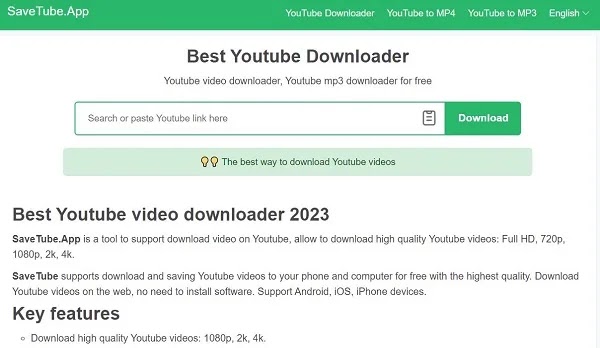 يعد موقع تنزيل YouTube SaveTube.App أداة لدعم تنزيل فيديو YouTube، حيث يوفر إمكانية تنزيل مقاطع فيديو YouTube بجودة Full HD و720p و1080p و2K و4K. يدعم SaveTube تنزيل مقاطع فيديو YouTube وحفظها على هاتفك ونظامك مجانًا وبأعلى جودة. قم بتنزيل مقاطع فيديو YouTube على الويب، دون الحاجة إلى تثبيت البرنامج؛ وهو يدعم أجهزة أندرويد، iOS، آيفون.