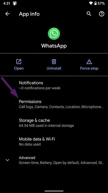 وبدلاً من ذلك، يمكنك الضغط لفترة طويلة على أيقونة تطبيق WhatsApp وتحديد app info من قائمة السياق التي تفتح. سينقلك ذلك مباشرة إلى قائمة معلومات التطبيق. هناك، حدد قائمة Permission وقم بتمكين أذونات Microphone و Camera.