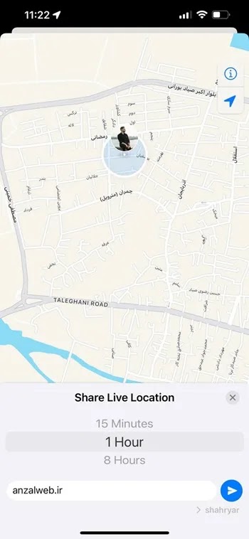 اختر المدة التي تريد مشاركة موقعك المباشر فيها. بشكل افتراضي، يتم تحديد ساعة واحدة. يمكنك أيضًا اختيار 15 دقيقة أو 8 ساعات. يمكنك أيضًا إضافة رسالة توضح سبب مشاركة موقعك المباشر. وأخيرا، اضغط على زر الصاروخ "Send".