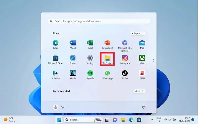 انقر على أيقونة Windows الموجودة على شريط المهام. ثم حدد File Explorer من قسم البرامج المثبتة.