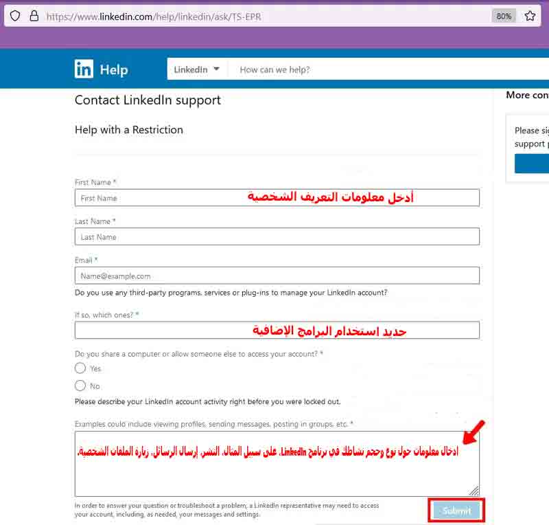 إحدى أفضل الطرق التي يمكنك استخدامها لحل المشكلات واستعادة حسابك على LinkedIn هي الاتصال بالدعم. في قسم دعم LinkedIn ، يمكنك إكمال ملفك الشخصي عن طريق إدخال بعض المعلومات الخاصة بك في القائمة، وكذلك تحديد استخدام البرامج الأخرى بالإضافة إلى LinkedIn (إن وجدت).