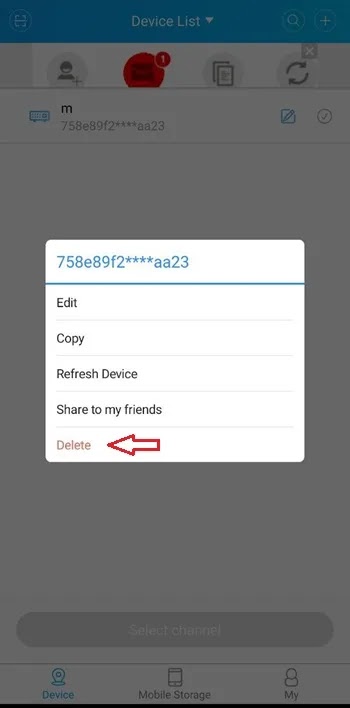 لإزالة جهاز DVR، أدخل برنامج XMEye واضغط على القلم أو أيقونة التحرير بجوار جهاز DVR في علامة تبويب Device.