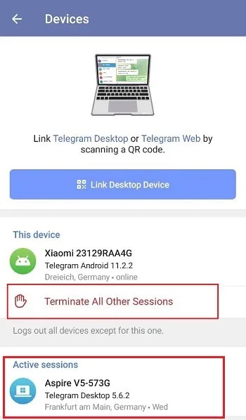 على الهاتف المحمول، انتقل إلى Settings > Privacy and Security > Active Sessions (Devices). في إصدار سطح المكتب، انتقل إلى Settings > Devices. هنا يمكنك رؤية قائمة الأجهزة المتصلة بحسابك. من خلال تحديد خيار Terminate All Other Sessions، تأكد من أن جميع الأجهزة باستثناء الجهاز الحالي لديها حق الوصول إلى Telegram.