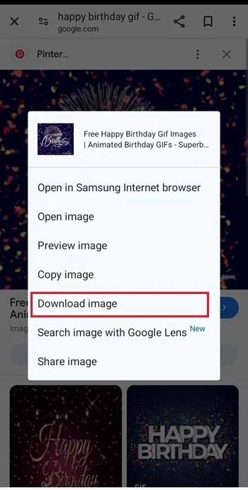 - على نظام Android، افتح الصورة المتحركة المطلوبة وانقر عليها مع الاستمرار حتى يتم عرض القائمة، ثم حدد Save Image أو Download Image.