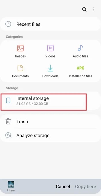 ارجع إلى صفحة تطبيق My Files وحدد Internal Storage.