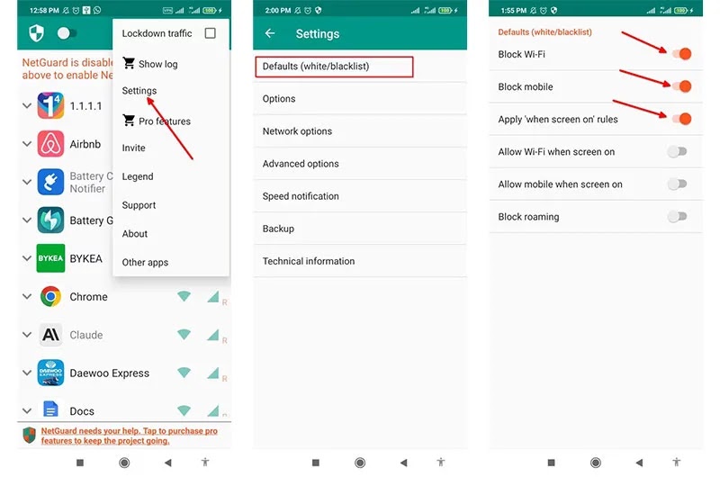 بدلاً من حظر برنامج ما من الاتصال بالإنترنت بشكل كامل، يمكنك أيضًا استخدام خيارات Blacklist او Whitelist في NetGuard. للقيام بذلك، اضغط على قائمة النقاط الثلاث وافتح الإعدادات. في هذا القسم، انقر فوق الخيارات Defaults لتمكين Block Wi-Fi و Block Mobile. لوضع البرامج في القائمة البيضاء ومنحها إمكانية الوصول مرة أخرى، ما عليك سوى تحديد Apply when screen on rules.