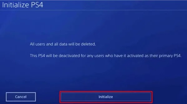 إعادة ضبط إعدادات المصنع لوحدة التحكم: أدخل Settings من خلال الصفحة Home؛ حدد Initialization. حدد خيار Initialize PS4 ثم الخيار Full. سيؤدي هذا إلى حذف مساحة تخزين نظام PS4 تمامًا. حدد زر Initialize للمتابعة. حدد الزر Yes لبدء عملية Initialization.
