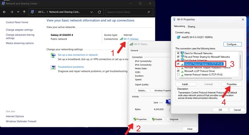 يمكن أن يكون تغيير DNS في Windows عاملاً آخر يؤثر على إعدادات الإنترنت والشبكة. لهذا السبب، يوصى عادةً باستخدام Google DNS أو DNS صالح آخر على النظام. للقيام بذلك، تحتاج أولا إلى الدخول إلى قسم Control panel في النظام. ثم انتقل إلى Network and sharing center. في هذا القسم يمكنك رؤية الشبكات المتصلة. في الخطوة التالية، عليك النقر فوق الشبكة المطلوبة وبعد عرض الصفحة الجديدة، انقر فوق الزر "Properties". ثم انقر فوق خيار Internet Protocol Version وحدد زر Properties مرة أخرى.