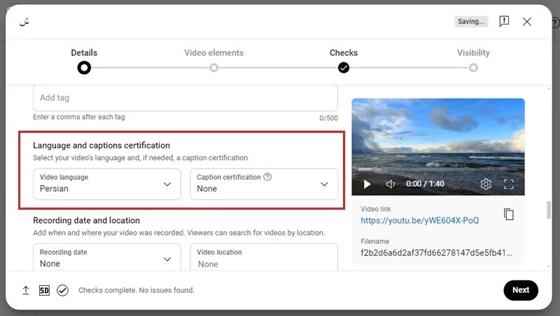 قم بتعيين لغة الفيديو الخاص بك في هذا القسم وقم بتعيين قسم Caption certification على None.